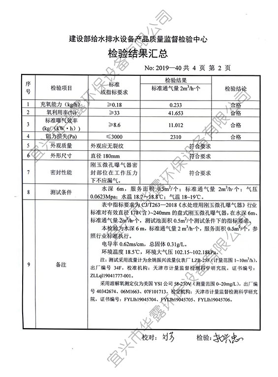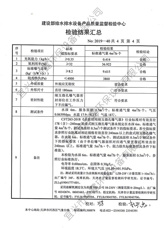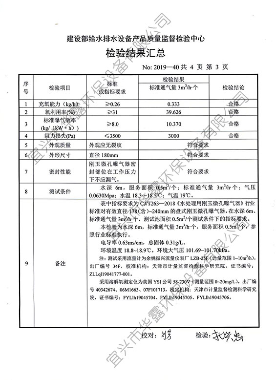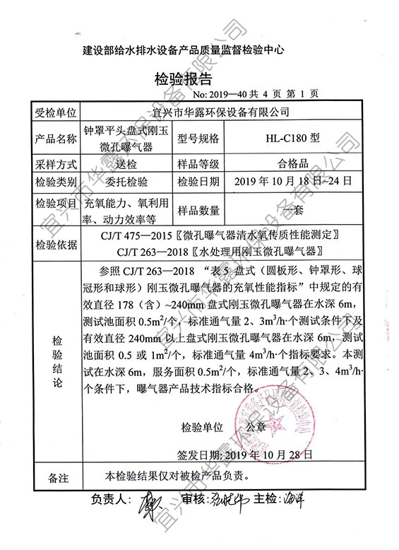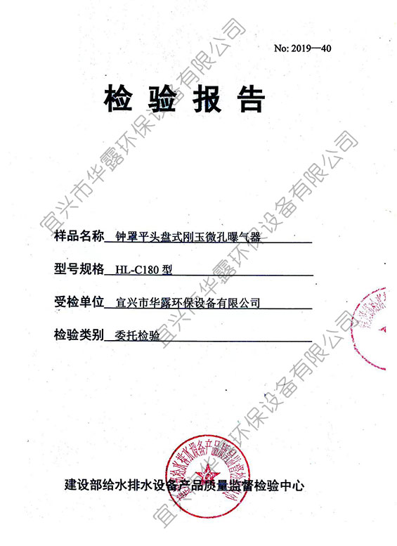 鐘罩平頭盤式剛玉微孔曝氣器HL-C180型檢驗報告